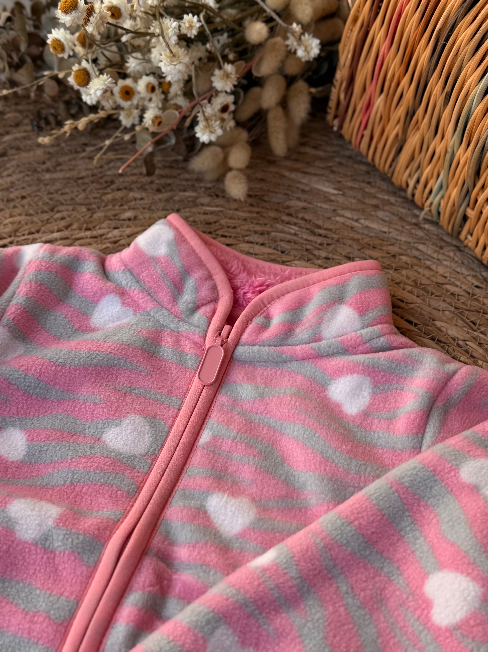 Add a touch of fun to winter days with this soft fleece jacket featuring playful pink zebra stripes and white heart prints. Designed for comfort, it’s perfect for layering and keeping your little one warm.