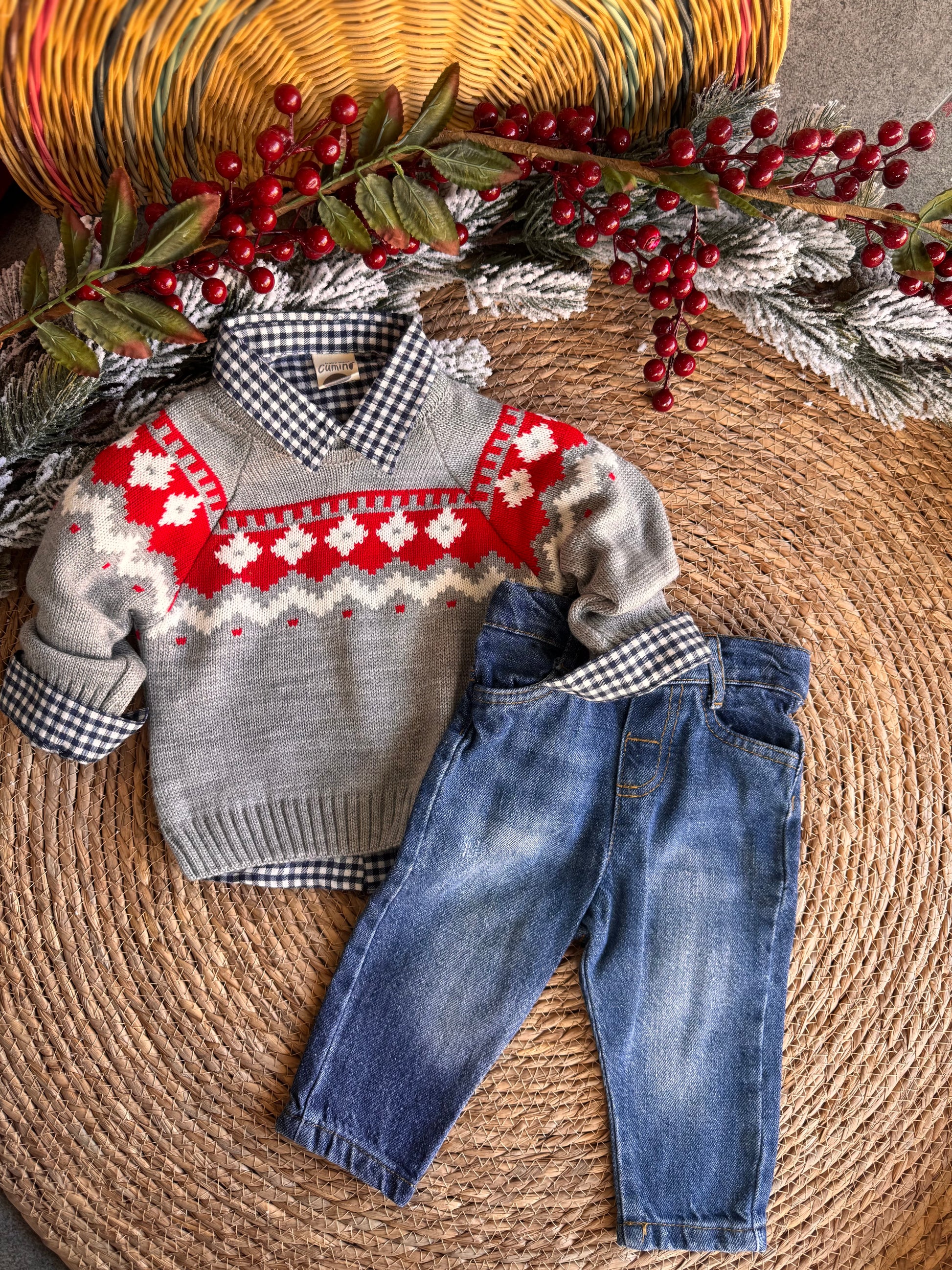 This charming look features a soft grey knit sweater with red holiday patterns, layered over a classic checkered shirt, paired with comfortable denim jeans. A timeless combination that brings warmth, style, and Christmas spirit together.