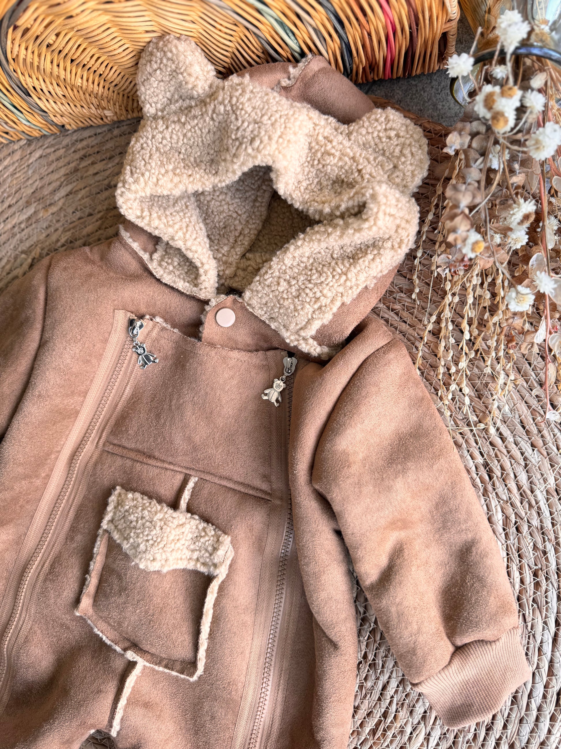 A luxuriously soft hooded baby suit designed to keep your little one warm and cozy. Crafted from plush, gentle fabric with a teddy-soft lining, it features a full front zip for easy dressing and a sweet front pocket detail. The hood adds extra warmth, making this suit ideal for cooler days, strolls, and winter cuddles.