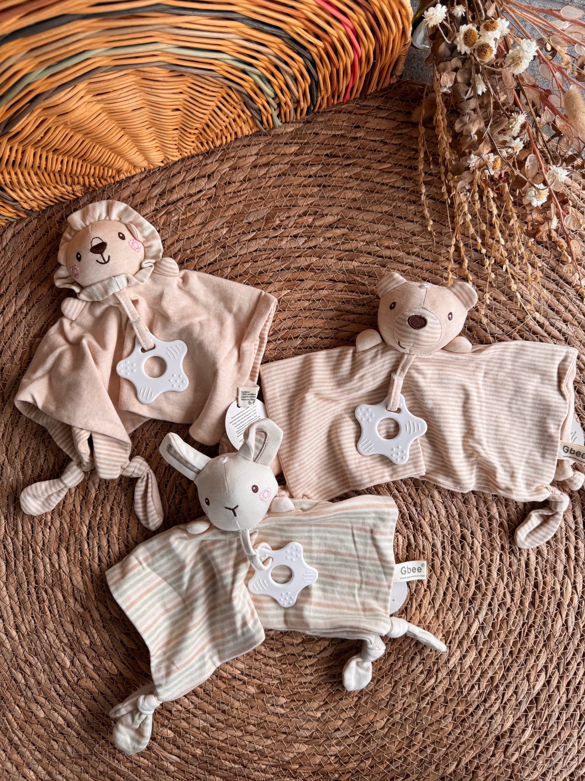 Perfect for cuddles, comfort, and on-the-go reassurance, these comforters combine plush fabrics, knotted corners, and a soft teether to support tactile development and self-soothing. Their timeless design makes them a beautiful and practical gift for newborns and infants.