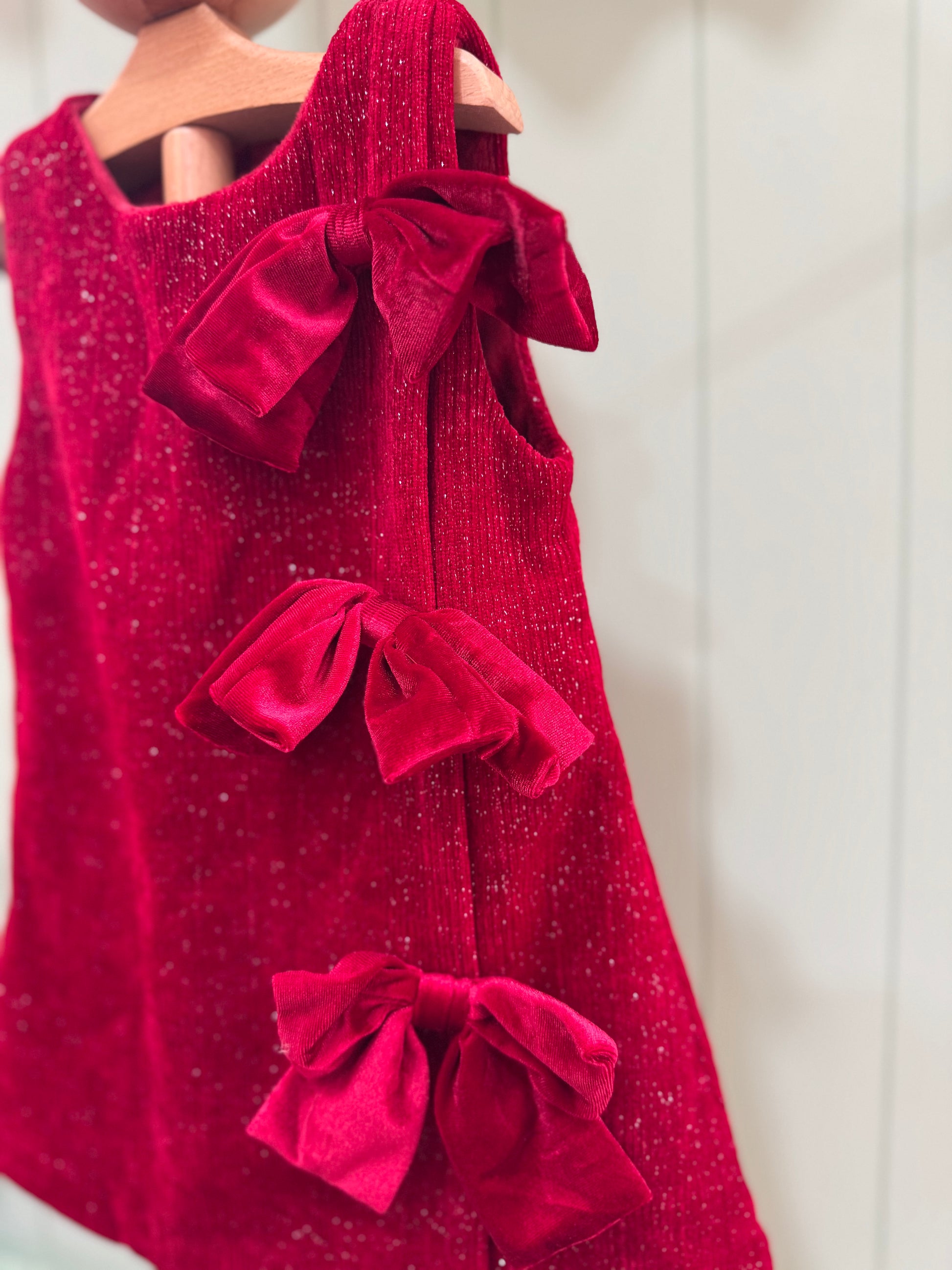 Our Velvet Bow Dress is crafted from soft, shimmery corduroy velvet that shines beautifully under the light. Designed in a rich ruby red shade, it features three statement velvet bows along the side — adding the sweetest touch of charm and elegance. Perfect for Christmas celebrations, family photos, or any special winter occasion.
